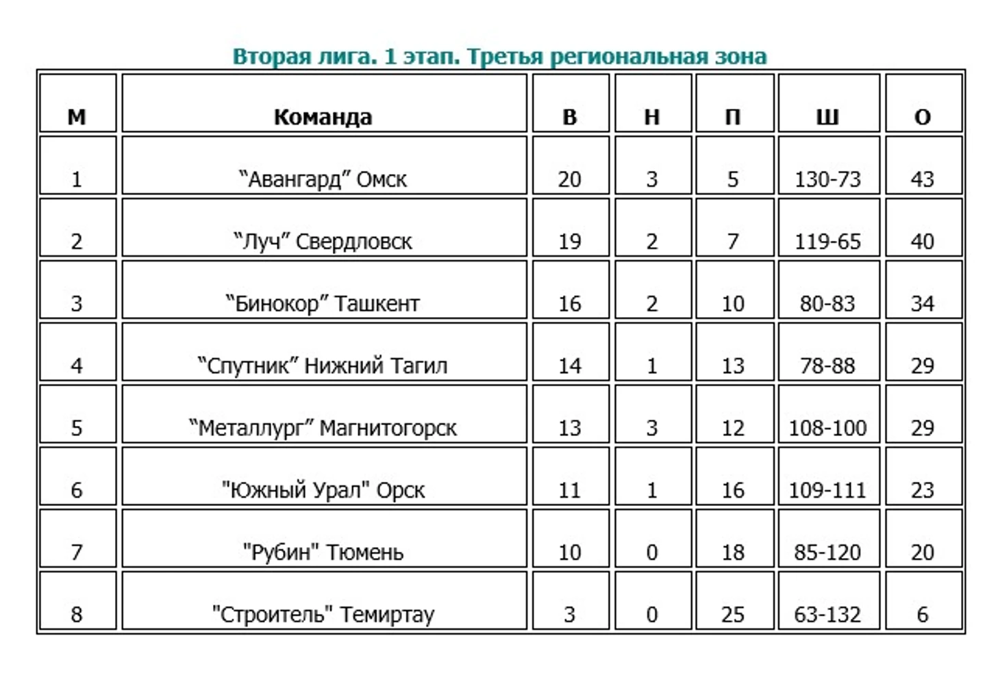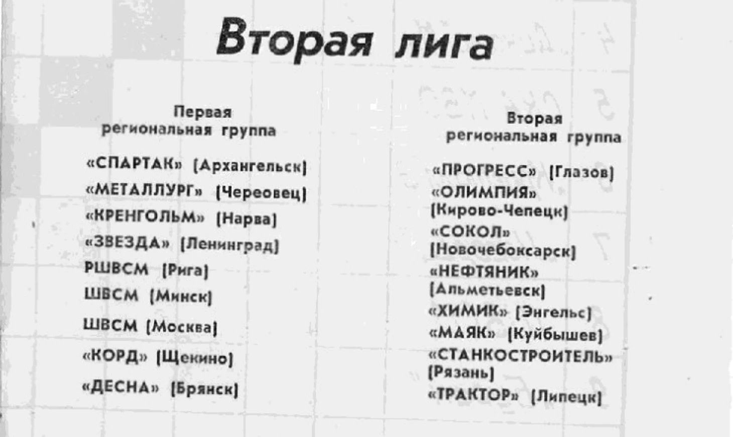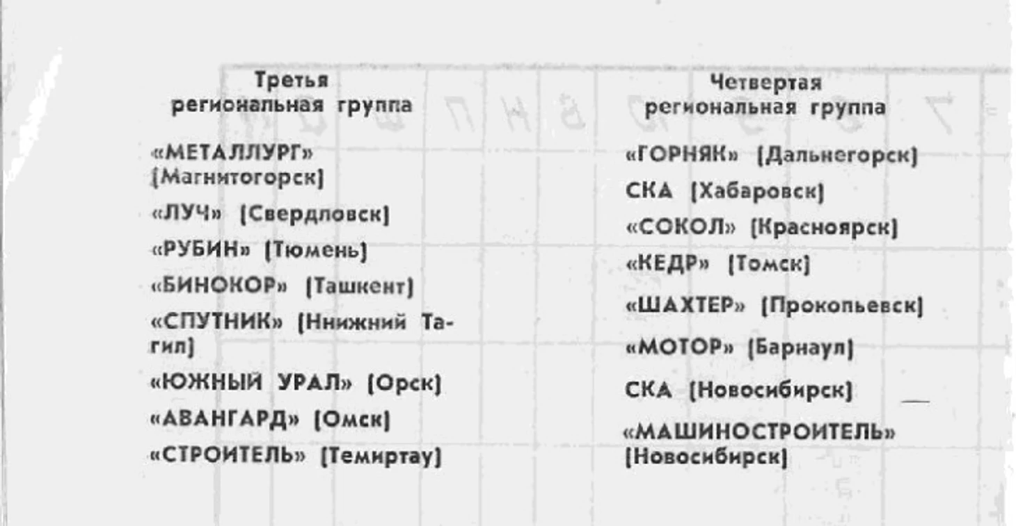 Во второй лиге, где играло тридцать три команды, было сформировано четыре региональных группы (зоны), вытянутых с севера на юг и делящих территорию страны с запада на восток. В предыдещем сезоне их было шесть, и они были похожи на часовые пояса. «Бинокор» попал в третью зону, которую условно можно назвать «Уральской». Кроме, самого Урала в нее входил запад Западной Сибири и все то, что лежало южнее их – Казахстан и Средняя Азия (скорее всего и Предуралье относилось бы сюда - играй уфимский «Авангард» в этом сезоне во второй лиге, а не в первой, он бы тоже, наверное, играл бы здесь).