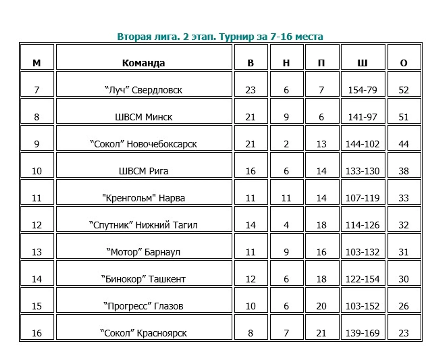 На втором этапе из команд, занявших в первой группе места с пятое по девятое, а во второй с пятое по восьмое, образовывалась одна подгруппа, еще одна из клубов, оказав­шихся в третьей и четвертой группах на пятом-восьмом местах. Они играли в четыре круга с учетом набранных оч­ков. Затем по три слабейших представителя от подгрупп играют между собой в один круг за право остаться во второй лиге (ранее на­бранные очки не учитываются). Самая последняя команда выбывает из состава участников чемпионата СССР. Ее заменяет победитель всесоюзного турнира коллективов физкульту­ры, проводимого Госкомспортом РСФСР.