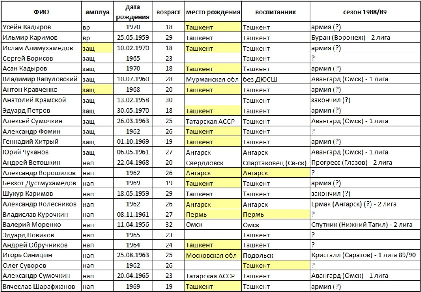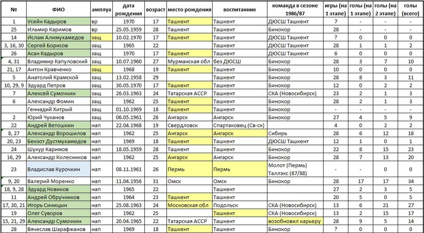 Если всех посчитать (в том числе и Геннадия Хитрого с Исламом Алимухамедовым – первый в чемпионате за «Бинокор» не играл, о втором данные разнятся), то получается, что воспитанников ташкентской ДЮСШ в команде в сезоне 1987/88 годов было восемнадцать человек (почти две трети состава), а школ из других городов (включая сюда и Владимира Капуловского, получившего хоккейное образование «во дворе») – восемь. И это самый «ташкентский» состав ташкентцев за всю их историю, начиная с 1971 года, когда тогда еще «Спартак» стал играть в чемпионатах страны.