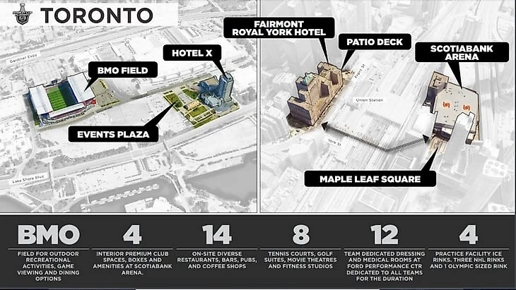 Схематично «пузырь» в Торонто выглядит вот так – оба отеля находятся в шаговой доступности от хоккейного стадиона: