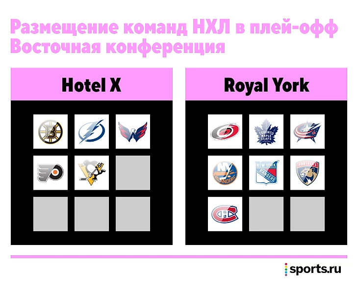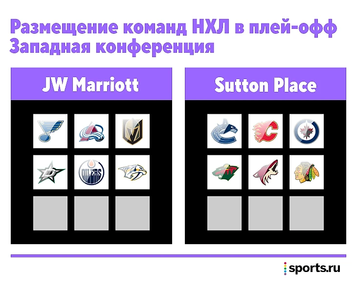 В двух городах НХЛ выбрала четыре отеля, которые максимально подходят под требования лиги – восточные клубы будут жить в Hotel X и Royal York в Торонто, а западные разместятся в эдмонтонских JW Mariott и Sutton Place.