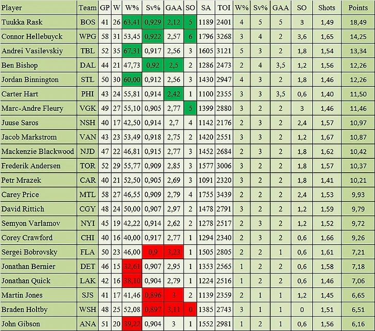 Я не стал ограничиваться только тремя голкиперами и изучил статистику всех вратарей, которые провели минимум 40 матчей. Всего таких голкиперов в нынешнем сезоне было 22. За первые три показателя я начислял им баллы от 1 до 5. Баллы за сухие матчи ─ кол-во шатаутов умножалось на 0,8. Баллы за загруженность шли в таблицу с умножением на 3. Получилась в итоге такая таблица.