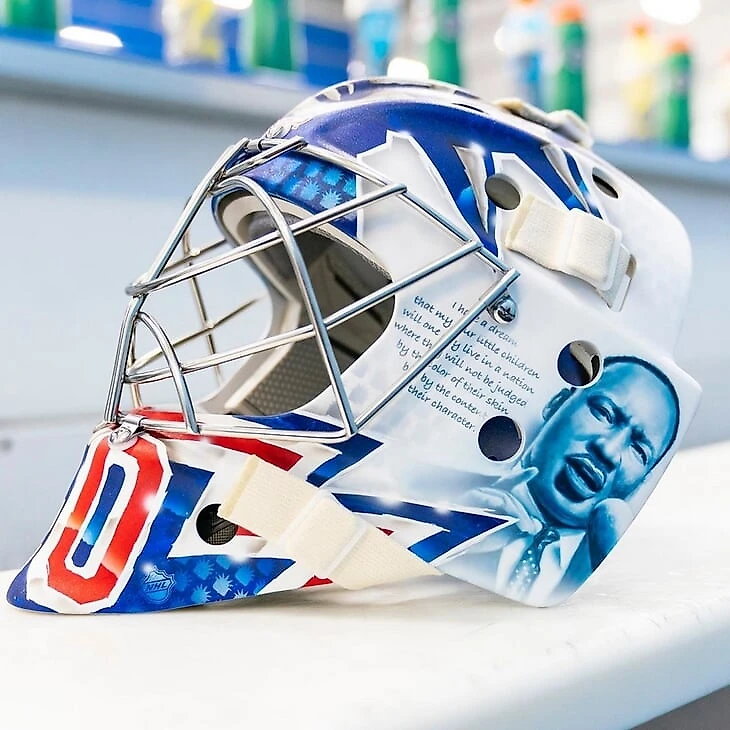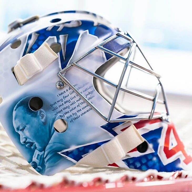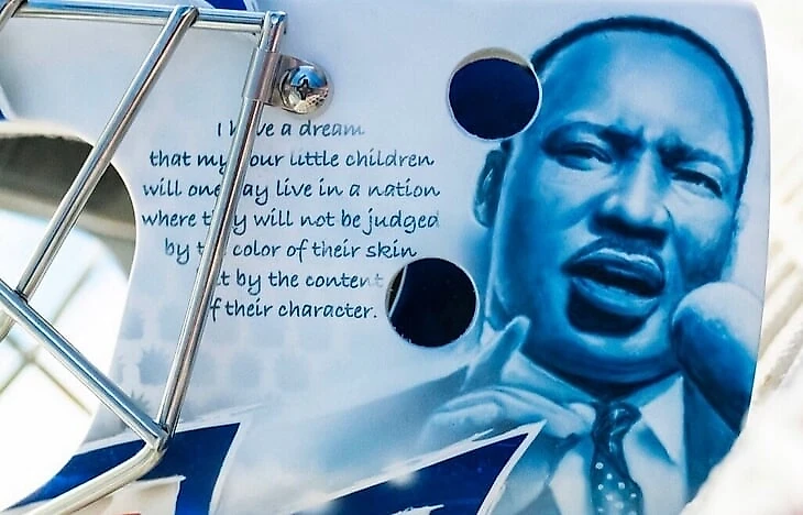 На ней известный дизайнер вратарских масок Дэйв Гуннарссон изобразил портрет Мартина Лютера Кинга – главного активиста в борьбе за права чернокожих в США. Также на маске есть самая известная цитата Кинга: «Я мечтаю, что четверо моих детей будут жить в стране, где их будут судить не по цвету кожи, а в соответствии с их личностными качествами».