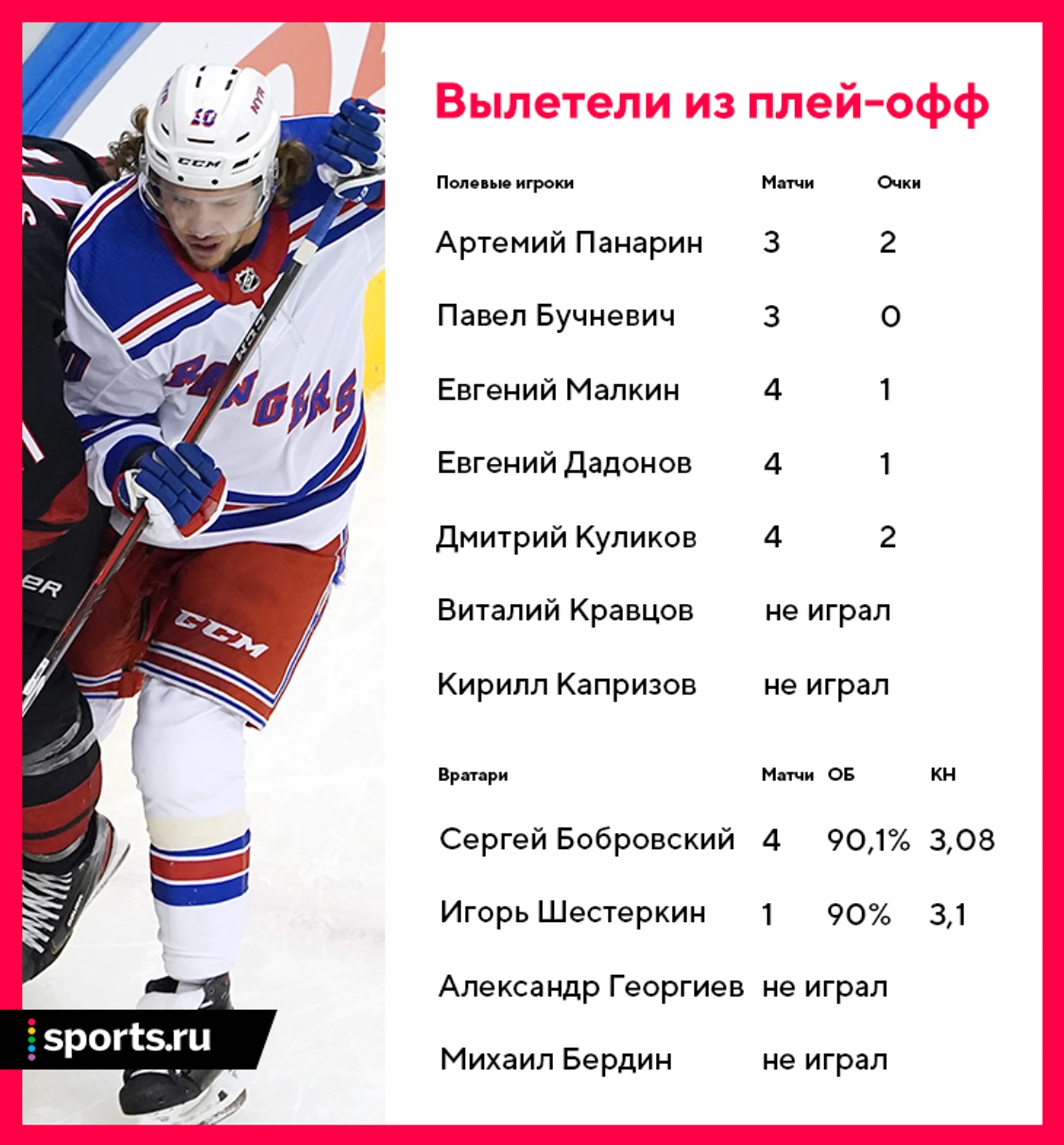 «Рейнджерс»: Артемий Панарин, Игорь Шестеркин, Павел Бучневич + Виталий Кравцов, Александр Георгиев (не играли)