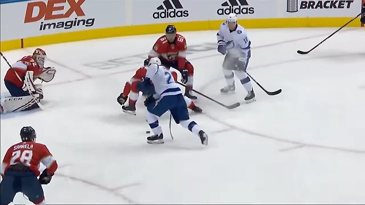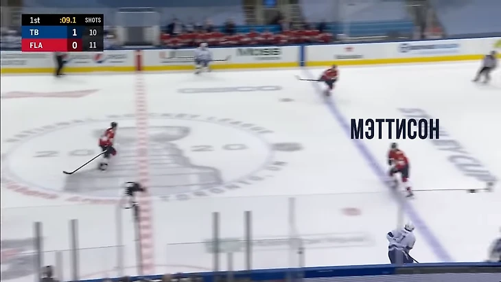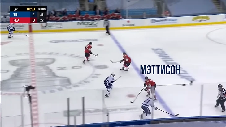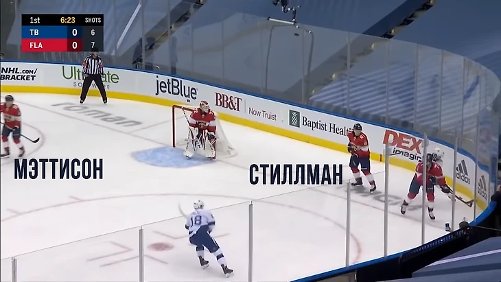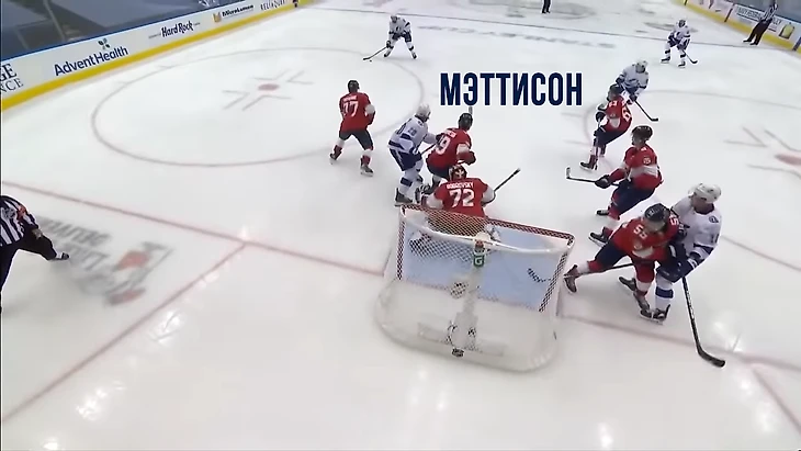 Защитник Мэттисон поднимал клюшку нападающему Тампы (чтобы не побыло подставления), но все равно только мешал обзору.