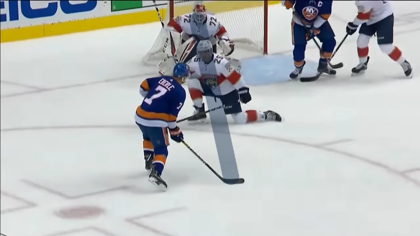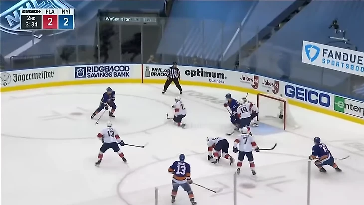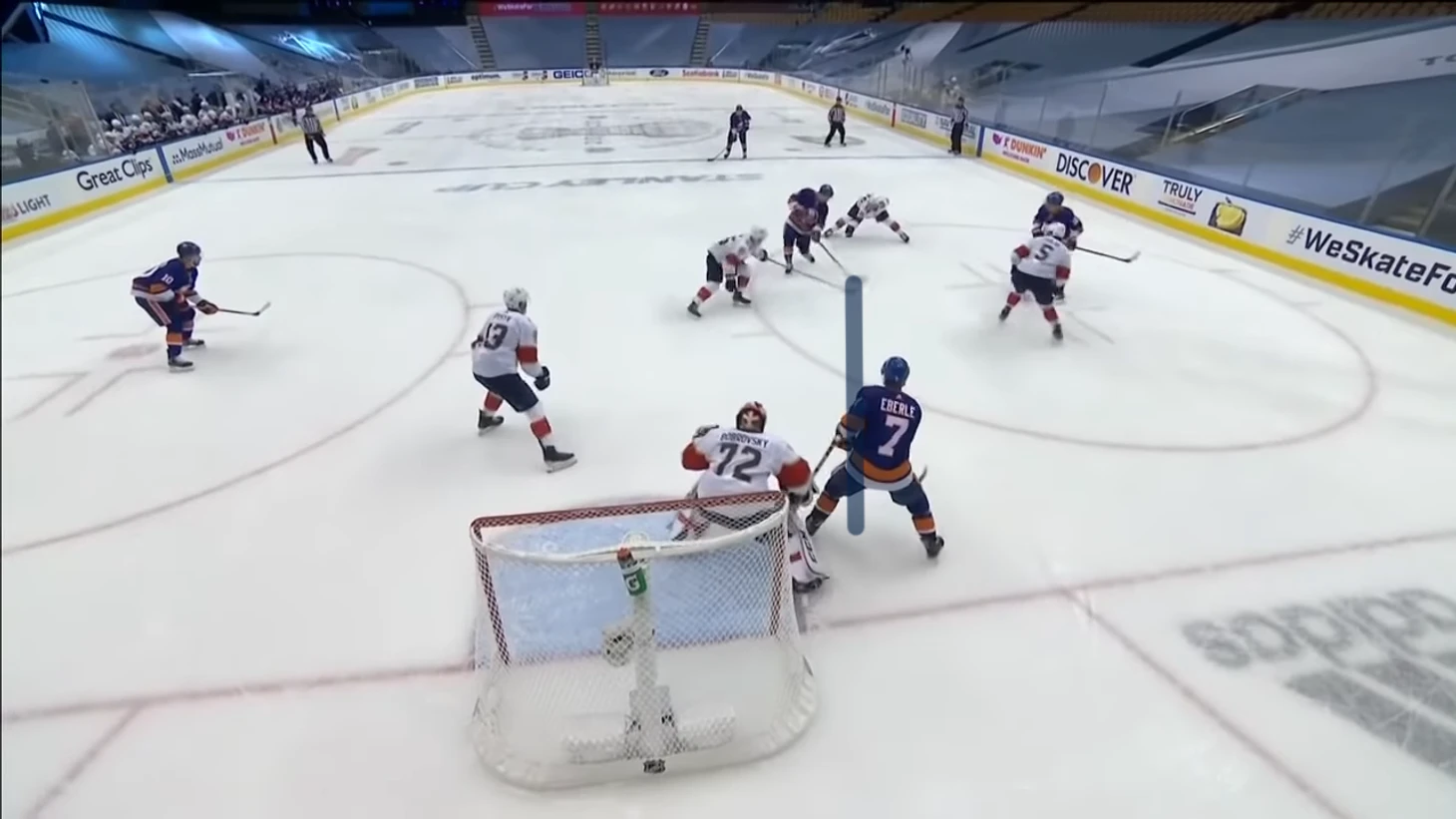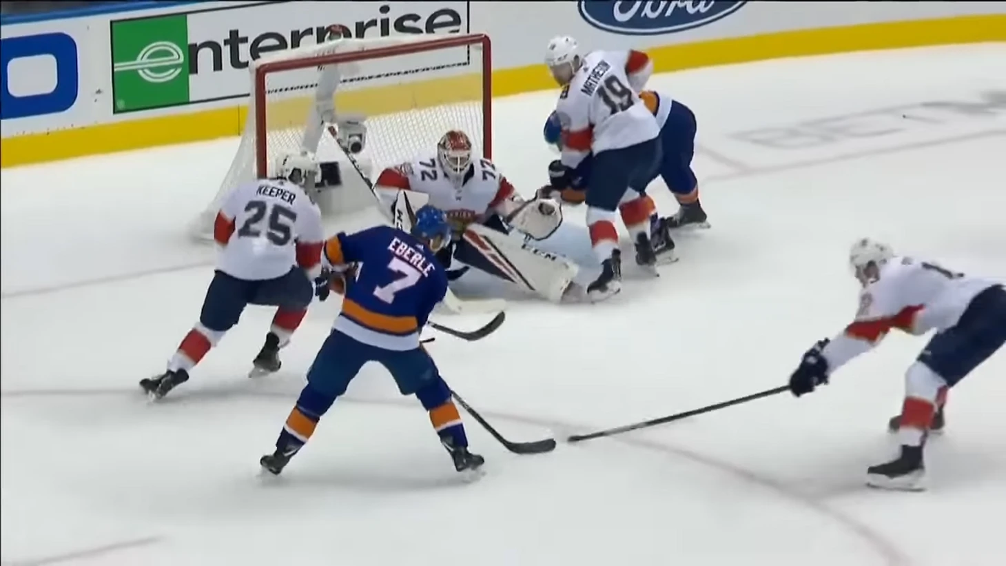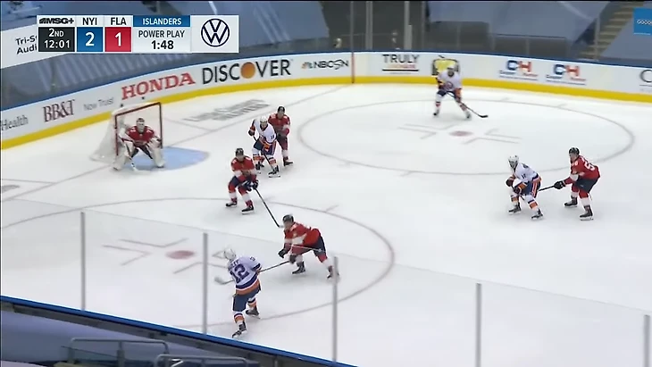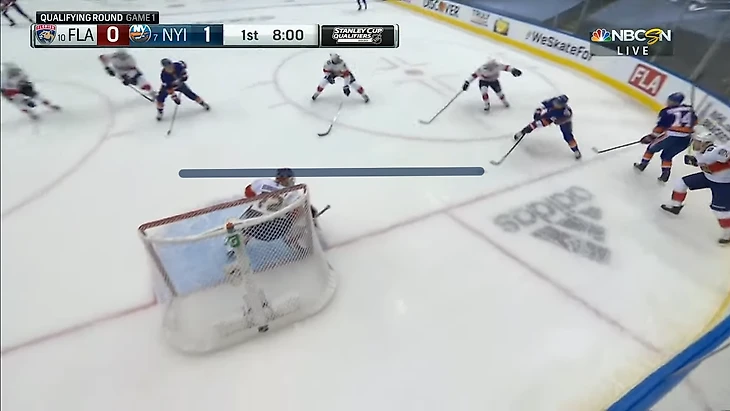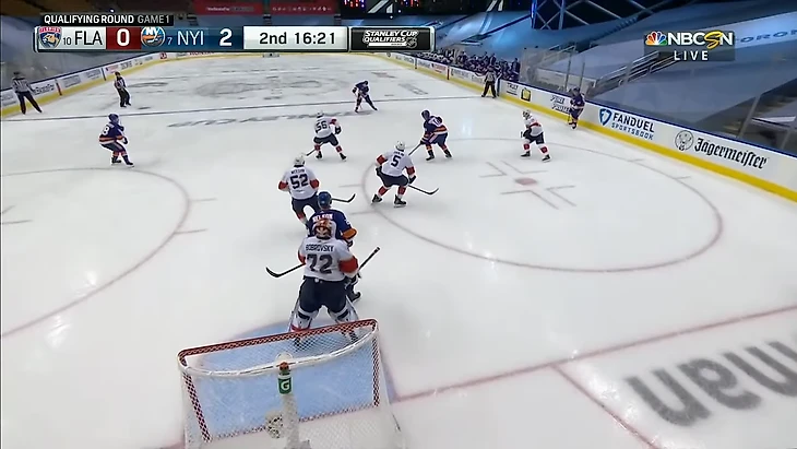 Равные составы, но Эберле спокойно получает шайбу в левом круге вбрасывания. Нападающего Айлендерс должен быть держать защитник Кипер.