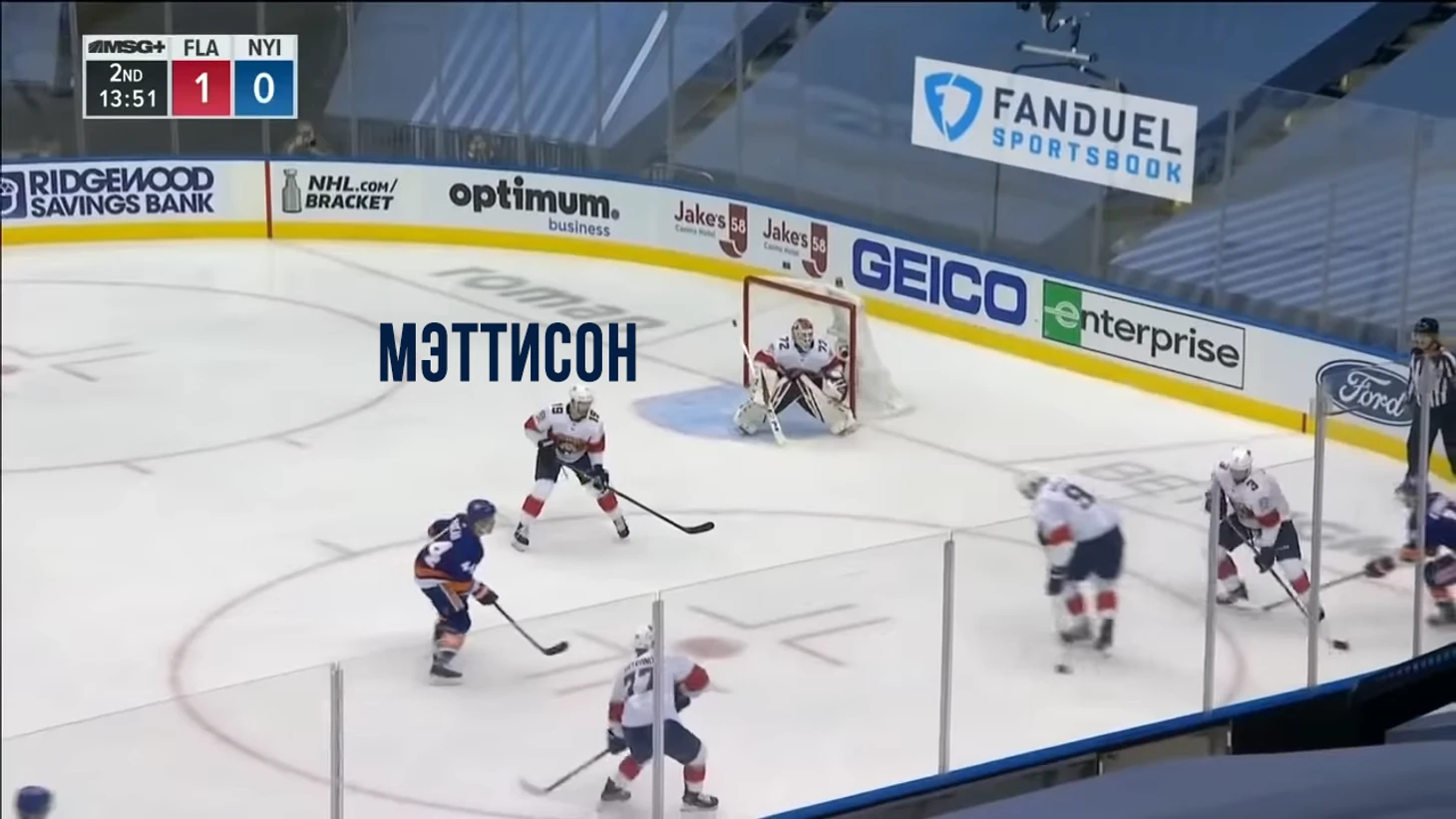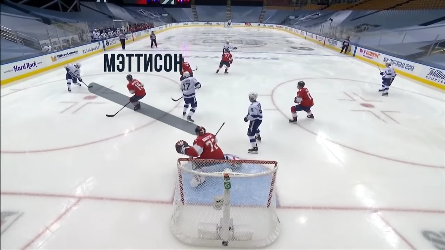 Опять видим Мэттисона, который никак не помешал броску, но еще и частично перекрывал обзор