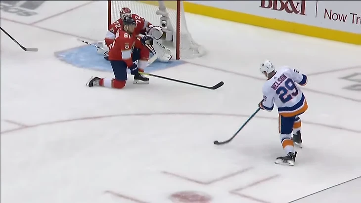 Похожий момент с меньшинством из первого матча. Нельсон опять перекрывает обзор, только в этот раз Бобровский должен видеть момент передачи.