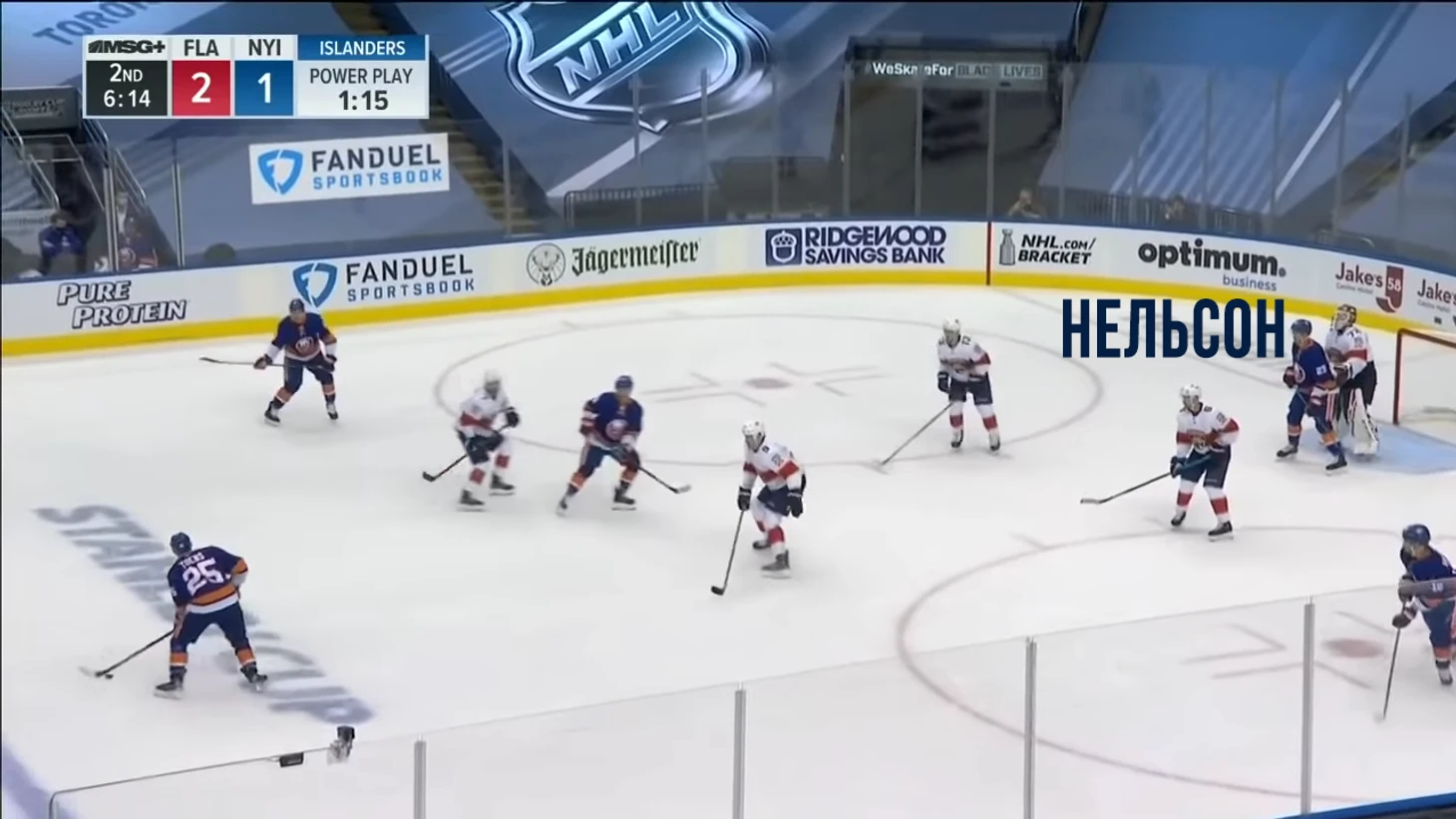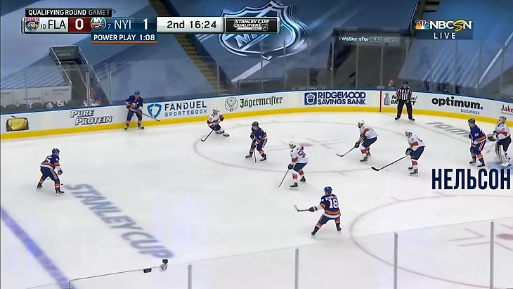 Только деревянный Нельсон — не Кучеров, поэтому ему нужно еще одно касание. Бобровский перекрывает низ. Защитник Стиллман перекрывает опасное ничего. Но бросок получается идеальный, прям под перекладину.