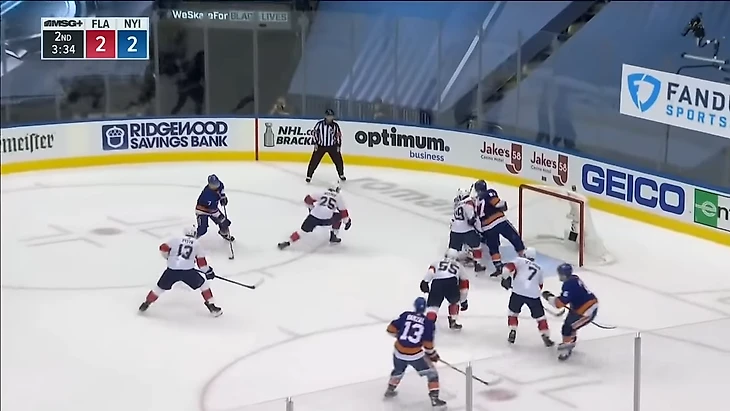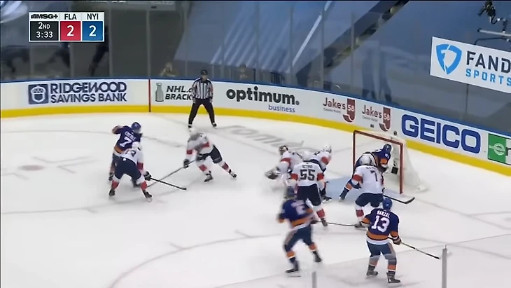 Поэтому не смог помешать сделать передачу. В итоге шайба отправляется на пятак, где Пажо в окружении четырех игроков Флориды забивает.