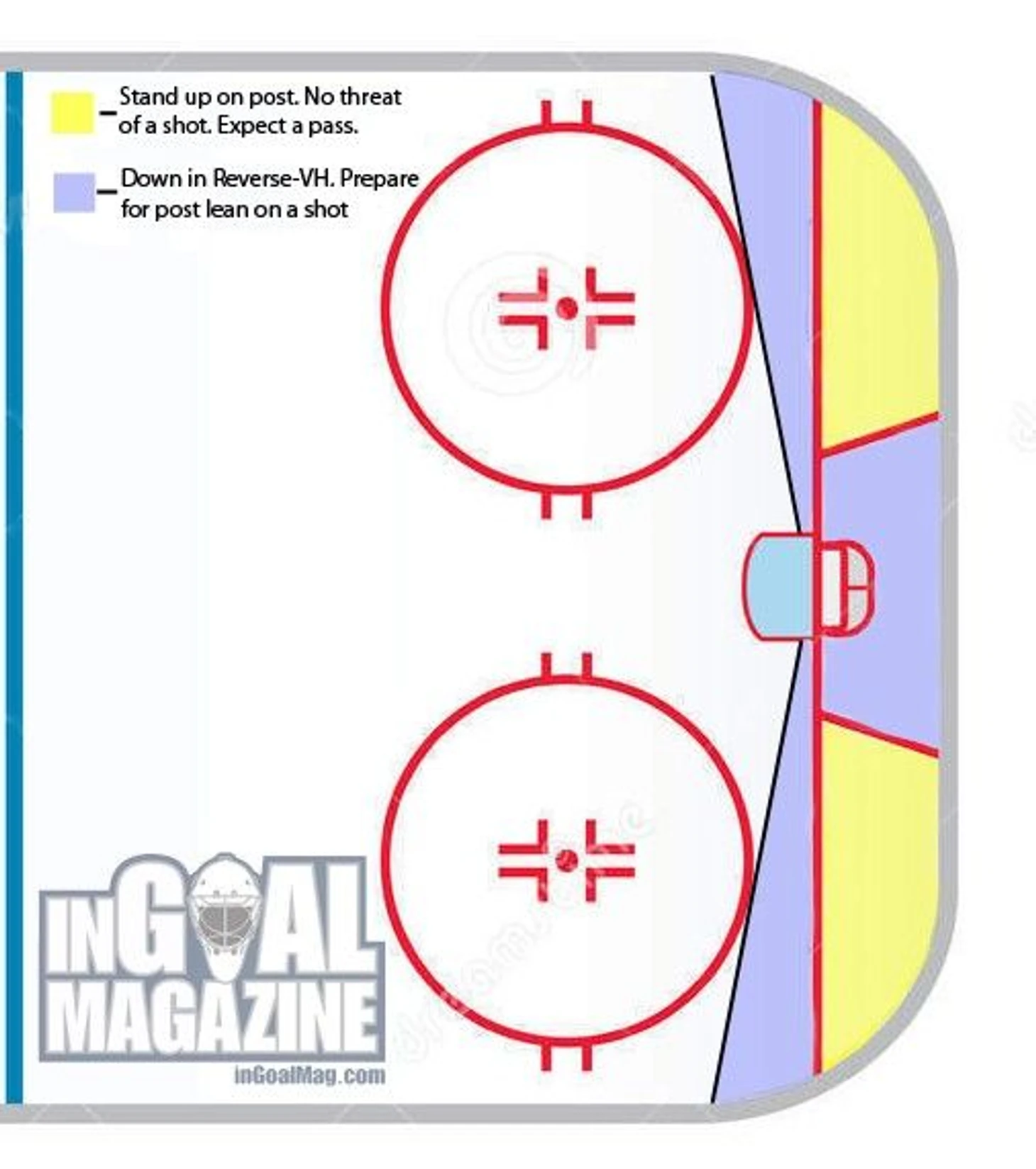 Но реверс — это не панацея. В любом случае невозможно полностью перекрыть ворота. Если вратарь использует реверс в неподходящих ситуациях — он может сделать для себя только хуже. Каждый вратарь индивидуален, поэтому его игра зависит от физических данных, личных предпочтений и работы с тренером. И использование реверса тоже у всех разное: кто-то любит и сидит в таком положении очень часто, а некоторые реже. Но существует понимание, где реверс работает лучше всего — когда шайба под контролем у соперника в тех зонах, откуда могут нанести бросок. Желтая зона — бросать вряд ли будут с отрицательного угла. Вратари стоят у штанги и ждут паса. Фиолетовая — может случиться бросок. В таких случаях садимся в реверс.