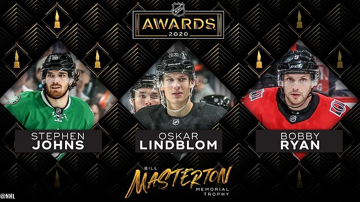 Билл Мастертон Трофи - приз хоккеисту, проявившему высокое спортивное мастерство и верность хоккею. Награда ежегодно вручается по итогам голосования членов Ассоциации журналистов НХЛ. 16 июля 2020 года НХЛ объявила претендентов на Билл Мастертон Трофи. В этом году на приз номинированы Бобби Райан, Оскар Линдблом и Стивен Джонс.