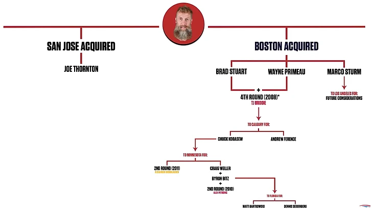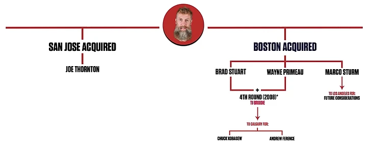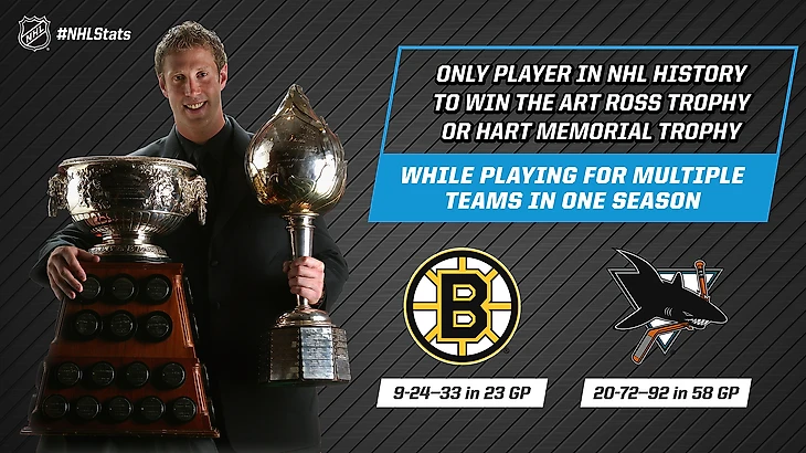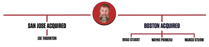 1104 игры, 251 гол, 804 передачи, 1055 очков - это всё статистика Джо Торнтона ТОЛЬКО в майке "Сан-Хосе" и БЕЗ учёта плей-офф! Пожалуй, перед обменом "Бостон" должен был сказать себе: "окей, мы обмениваем игрока, который набрал 33 очка в 23 играх, но уверены ли мы, что в другой команде он не наберёт больше?". Возможно, этот просто вопрос и уберёг бы "Бостон" от глупости, ведь Джо Торнтон в 58 оставшихся матчах за "Сан-Хосе" набрал... 92 очка - самый успешный сезон в его карьере! Арт Росс Трофи и Харт Трофи по итогам того сезона заслуженно отправились на хранение к нему домой - тогда он был лучшим в Лиге.