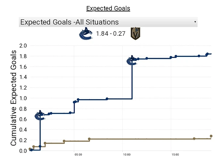 Не прошло и минуты, как Бесер выбросил шайбу из своей зоны на пустые трибуны - две минуты за затяжку времени, и это, пожалуй, были самые тяжёлые две минуты для "Ванкувера" в этом периоде: трижды бросал Пачиоретти, один из бросков которого был заблокирован, а когда Бесер выбежал со скамейки штрафников на помощь партнёрам, "Вегас" остался в зоне и бросил ещё трижды: Мартинез дважды промахнулся, а бросок Смита заблокировал Бигл. "Рыцари" были опаснее и давили весь период, перебросали "косаток" 22:7 во втором отрезке игры, даже несмотря на очередной провал при игре на точке (9:19), но сравнять или хотя бы даже удержать разницу в счёте к перерыву не сумели: после передач Эдлера и всё того же Тоффоли перед воротами снова оказался одинокий игрок "Кэнакс" - теперь это был Петтерссон, и на этот раз он выиграл дуэль у своего соотечественника, красиво переложив шайбу прямо перед Ленером и отправив её в сетку. Разница в две шайбы восстановилась, но теперь "Вегас" показал, за счёт чего может перевернуть ход неудачно складывающегося матча. Для сравнения ниже приведены графики динамики ожидаемых голов после первого периода и после второго: