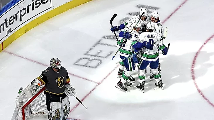1. Было мало сомнений, что "Ванкувер" проведёт второй матч лучше первого, но ураганная скорость канадского клуба в первом периоде стала решающим фактором победы: "Вегас" несколько раз ошибся в защите, абсолютно ничего не смог противопоставить звену Петтерссона, которое было просто неудержимо и напомнило перфомансы тройки Маккиннона в этом розыгрыше плей-офф. Два следующих периода прошли с давлением "рыцарей", и они вполне могли бы отыграться, если бы не два "но": отличная игра Якоба Маркстрёма и продолжающиеся ошибки "Голден Найтс" в защите, которые сегодня выражались не в привозах, а в банальной потере игроков. Народное творчество по мотивам этих ошибок не заставило себя долго ждать (на кадре момент с четвёртым голом "Ванкувера") :
