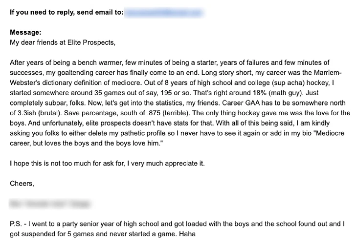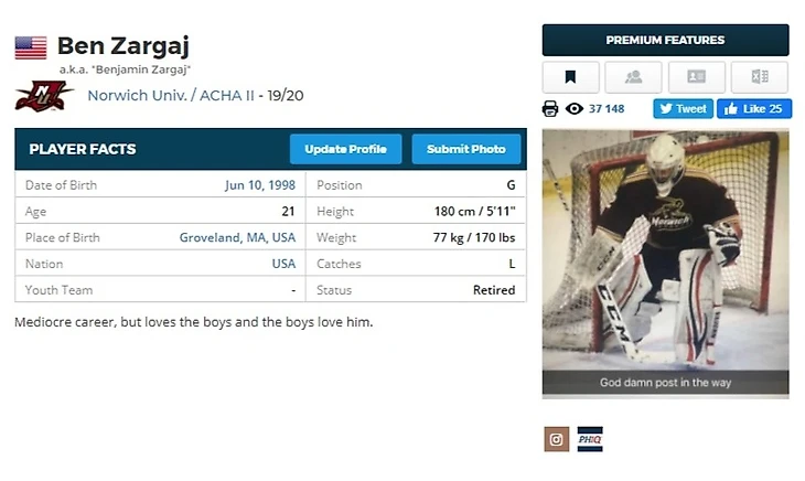 Практически сразу выяснили, что автор письма — 22-летний вратарь команды университета Норвича Бен Заргай. Бен очень недоволен своей карьерой и решил таким способом стереть из памяти 8 лет хоккейной карьеры. И как вы думаете, что сделали редакторы сайта, удалили статистику или дописали то, что было вторым вариантом? Да, EliteProspects обновил информацию о Бене и не удалил его статистику