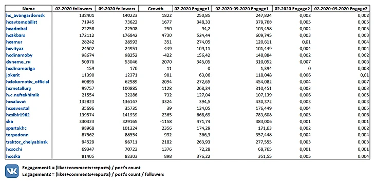 Статистика сообществ во вконтакте у клубов КХЛ накануне сезона 2020/21