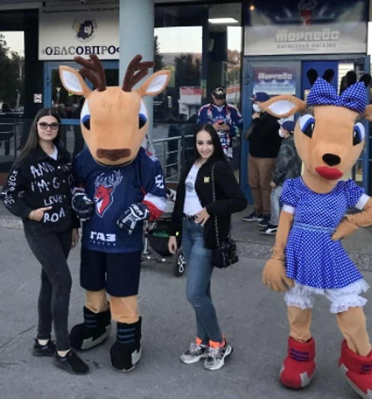 А справа можно посетить фирменный магазин ХК «Торпедо», обновив свой гардероб или же приобрести защитные маски для себя и своей семьи. Кроме этого там же зрителей встречали всеми любимые талисманы команды – Торрик и Виктория. Болельщики целомудренно соблюдали дистанцию 1,5 метра, по очереди подходя и делая фотографии с маскотами.