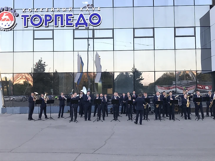 Слева от главного входа – живое исполнение нижегородского оркестра, мелодии знакомые, как любому болельщику, там и простому человеку, который, возможно, впервые пришел на хоккей.