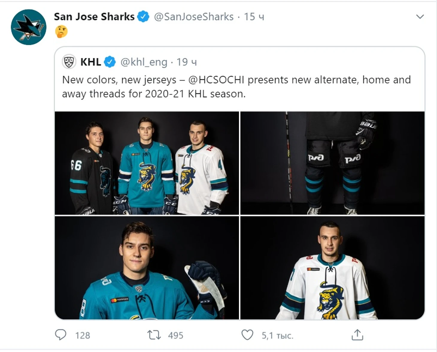 В комментарии к сочинском клубу достаточно быстро прибежали и болельщики из-за океана. Естественно стали отмечать аккаунт «Сан-Хосе» и сетовать не поразительное сходство. Удивительно, но клуб из Калифорнии молчать и правда не стал. Вчера вечером официальный Твиттер-аккаунт «акул» ретвитнул пост КХЛ о презентации новой формы «леопардов», сопроводив это всего лишь одним символом – сомневающимся эмоджи.