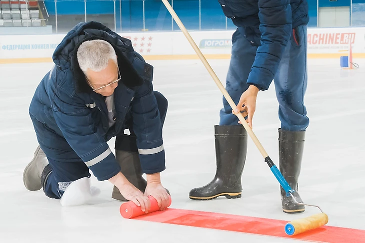 Процесс заливки льда не быстрый, но в этом деле важна не скорость, а технология. Сначала на плиту намораживают несколько слоев льда, а затем когда верхняя часть покрытия как следует замерзнет, наносится игровая разметка.