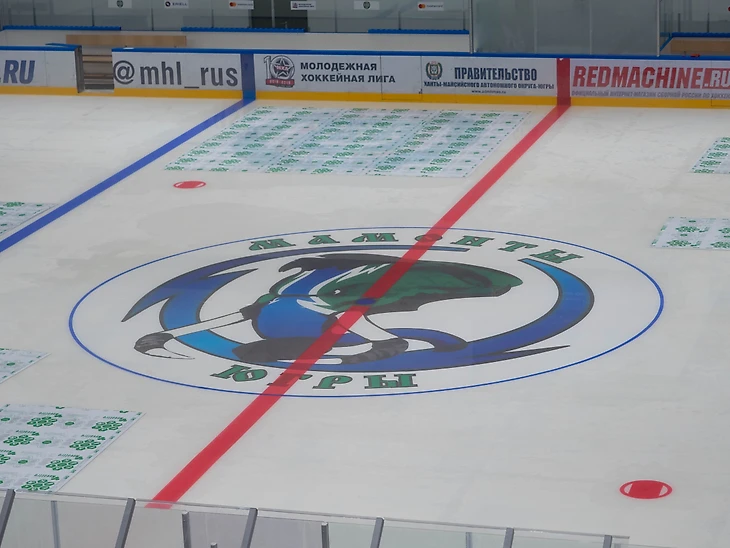 После начинается не менее любопытный процесс — нанесение рекламы. Изображения представляют собой баннеры, но не те, которые мы видим на улице, эти выполнены из более тонкого перфорированного материала. Благодаря его структуре баннер лучше вмерзает в лед. После того, как реклама занимает свое место на игровом поле, сверху намораживается еще один слой льда.