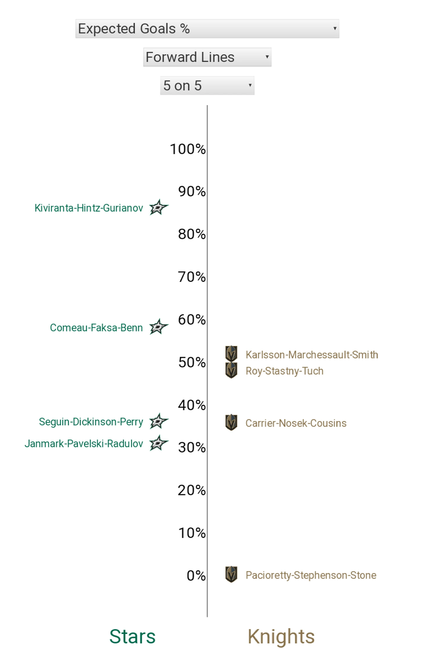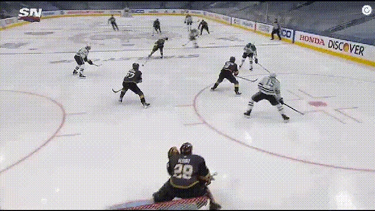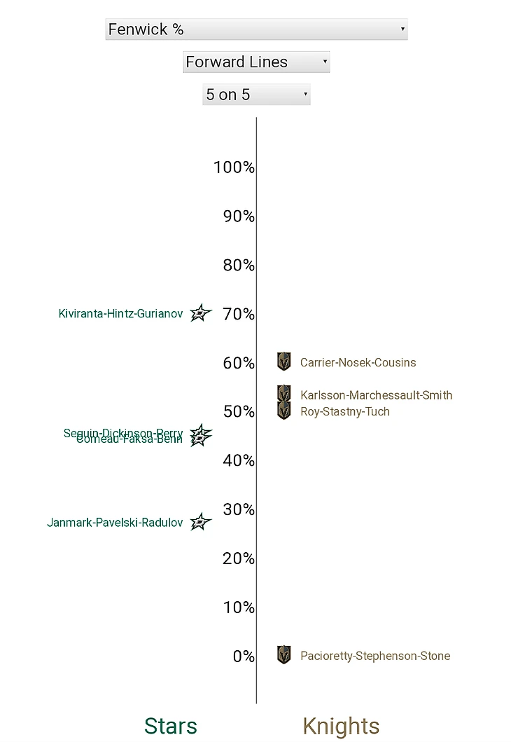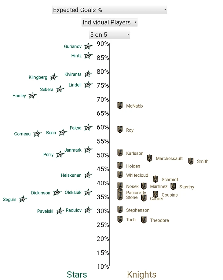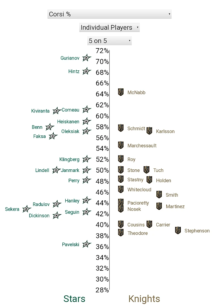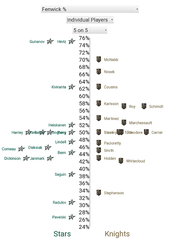 3. Вы знаете, что сейчас будет - как же я могу обойти стороной вбрасывания? В очередной раз "рыцарей" вчистую переиграли на точке (18:27, "Вегас" выиграл всего 40%), и отчасти именно это так осложнило жизнь команде Дебура - "Даллас" сегодня отлично обращался с шайбой и редко позволял себе терять её на ровном месте. Напрямую на счёт вбрасывания не повлияли, но проблем с отбором снаряда у "Найтс" было хоть отбавляй. Что касается отдельных личностей, то только Маршессо может занести себе этот показатель в актив (5/8).