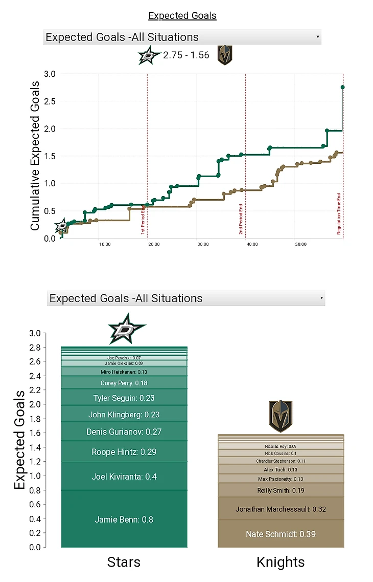 1. Впервые за долгое время "Вегас" не сумел создать больше соперника: "Даллас" был быстрее, "Даллас" был острее, "Даллас" победил по делу. Нет, это явно не была победа на классе, но в данной игре к результату не возникает никаких вопросов - кто что посеял, тот то и пожал. Как и в провальных пятом и шестом матчах против "Ванкувера", "Голден Найтс" проявили полную безыдейность в атаке, но если тогда "рыцари" напрягали чужую оборону от начала и до конца матчей, то сегодня заиграли лишь в третьем периоде. Ниже - карты бросков, xG, Corsi, Fenwick.