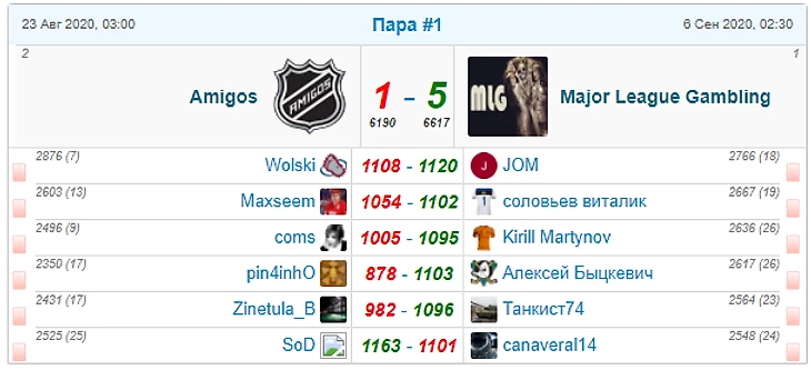 Чемпионы регулярки Amigos проиграли Major League Gambling в самом нерезультативном матче. Как то не уверенно и слабо провели Амигос раунд, 5 из 6 игроков даже не набрали средний результат по команднику. Major League Gambling контролировали ситуацию, где надо прибавив, чтобы обезопасить результат. Оставив приличное число замен, MLG выходят в полуфинал с неплохими шансами на успех.