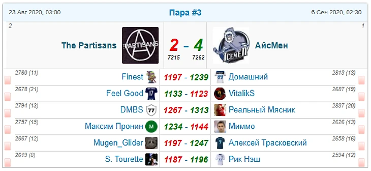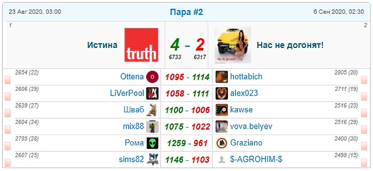 В этой паре серебряные призеры регулярки Истина хоть и не без волнений, но достаточно уверенно обыграли Нас не догонят! Шикарный результат (3й в туре - 1259) показал игрок Истины Рома, разгромив соперника с разницей в почти 300(!!!) очков. Истина оставила очень большой запас замен и сыграет в полуфинале с MLG