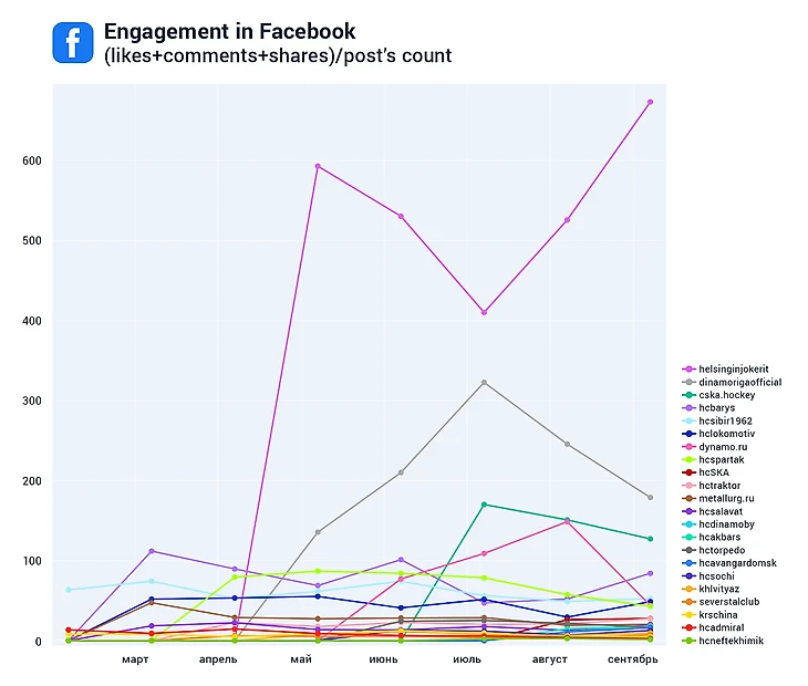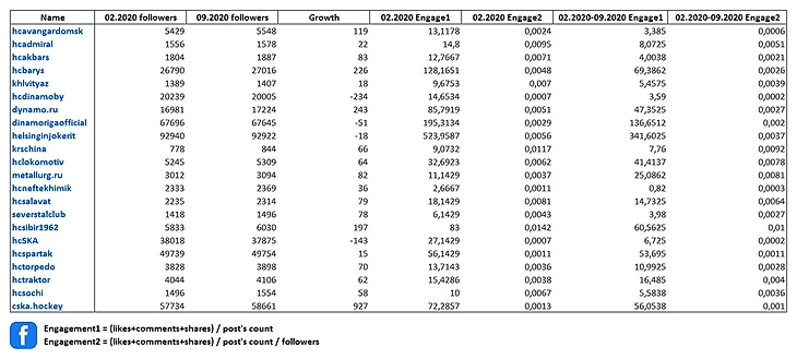 Статистика клубов КХЛ в фейсбук накануне сезона 2020/21