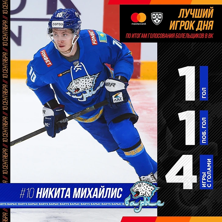 Стоит отметить, Никита установил новый рекорд «Барыса» по количеству игр подряд с начала сезона с заброшенными шайбами (4) и получив 47% голосов от болельщиков, Михайлис был признан лучшим игроком дня в КХЛ!