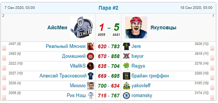 В этой паре уверенную победу одержали Якуповцы. Но я бы сказал, что заслуга не только в самих Якуповцах, сколько в провальном результате Айсменов. Ставка на Вегас и отсутсвие ключевых игроков Тампы больно ударило по Айсменам. Как красноречивый факт - никто из игроков команды Айсмен не набрал даже среднего результата по туру. Это позволило Якуповцам сильно не напрягаться и сохранить солидный запас замен на финал.