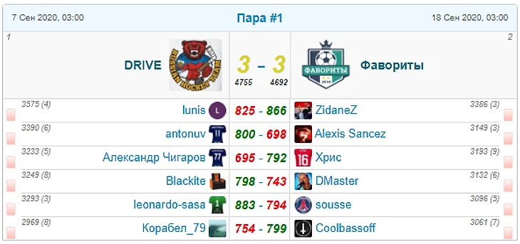 В первой паре была ровная игра. Обе команды показали очень хороший результат, но чуть удачливее оказались игроки команды DRIVE. leonardo-sasa из DRIVE стал лучшим игроком тура, а ZidaneZ из Фаворитов стал вторым в туре.