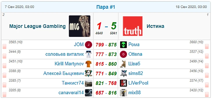 В первой паре Истина очень уверенно обыграла Major League Gambling. Во всех 5 выигранных парах игроки Истины имели солидное преимущество и довести до итоговой командой победы оставалось делом техники. Истина второй раз подряд выходит в финал Кубка Стэнли. Но если в прошлогоднем финале игроки Истины остались к финалу практически без замен и неполноценными составами вчистую слили Октябрю, то в этот раз у Истины порядочный запас замен, чтобы не только сделать боеспособный состав на финал, то и менять тактику в течении финальной серии по сопернику в зависимости от результата. Отмечу, феноминальный результат комадного фо 5041, а также то, что сразу 4 игрока Истины в 5-ке лучших по итогам тура! А лучший Рома уже 3-й в ОЗ!