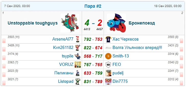 Во второй паре было очень напряженное и равное противостояние. До последнего результат был неясен. Все решилось в паре VORUZ 767 - 765 FEO, где VORUZ оказался чуть удачливее в последние дни. Победа Unstoppable toughguys на тоненького и возможность вернуться в НХЛ спустя несколько лет.
