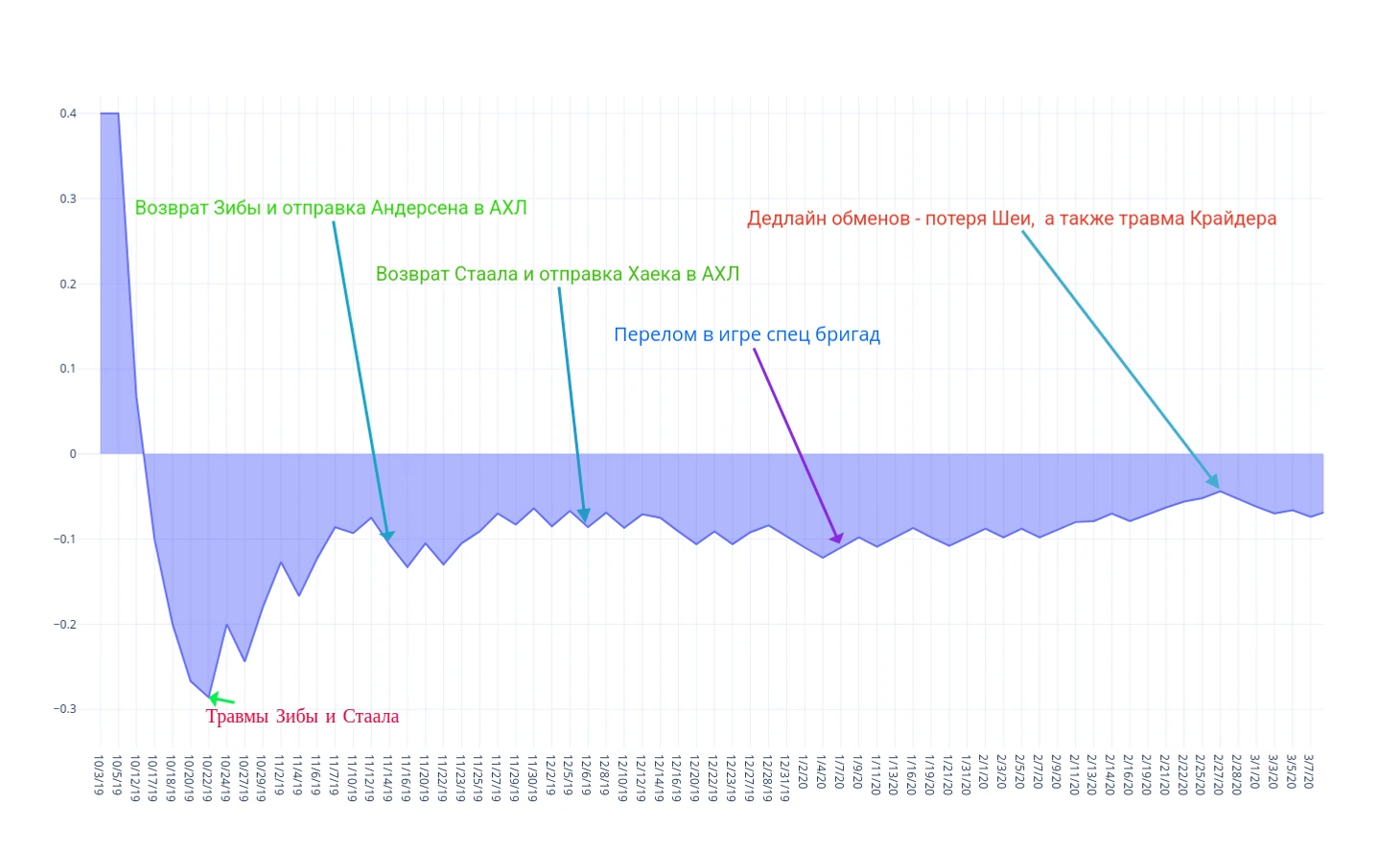У всех этих поражений подряд была весьма объективная причина (если не считать преследующую команду весь сезон проблему с системой обороны). Команда не могла забить, первую линию полностью закрывали три гола 5 на 5, вторая линия так же огрызлась 3мя голами, но только лишь потому-что всё внимание было отдано первой линии. Сама первая линия напропускала на своих игровых участках несколько голов первые 2 игры, за ней последовала следующие 3 игры вторая линия со своими проблемами в обороне. 3я и 4я линии полностью замолчали и практически не имели игрового времени, 3я линия 5 на 5 выходила в среднем на 12 минут и 4я линия играла по 6 минут (История с 4й линией так и не изменилась до конца сезона).