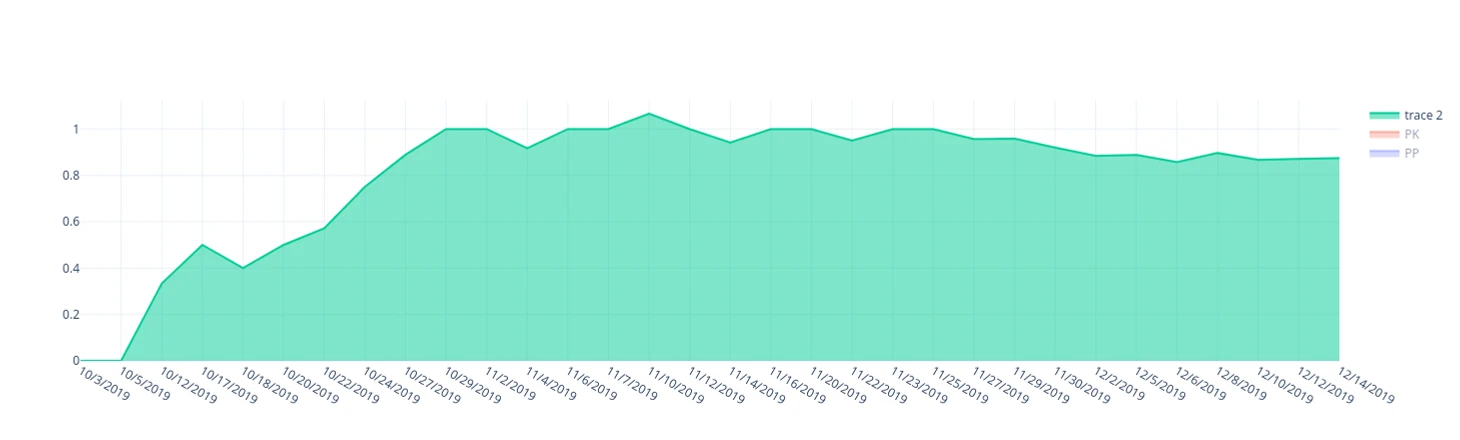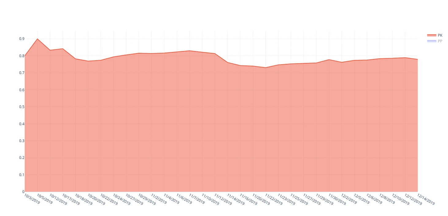 Итоговый процент реализации ПП за этот период составил лишь 20.5%, и разнообразные манипуляции с составом на первое полугодие особого прорыва или падения команде не дали если посмотреть график ниже, тоже самое можно сказать и о ПК, где итоговое засушение составило 78% и график достаточно равномерный. Естесственно график выражает средние значения и он достаточно сглажен, были хорошие игры были плохие игры, но в среднем как есть так есть.