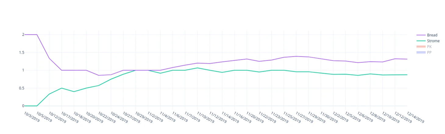 Горизонтальная ось игры, вертикальная ось средняя реализация ПП (синий) и ПК (красный) за конкретный период.