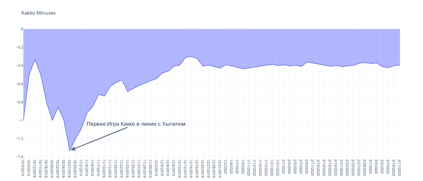 Я не буду говорить здесь о производительности Какко, она была достаточно спорадическая и не очень зависила от конкретных трендов. А вот то, что ставили Какко в основном минус - это его полезность, а точнее минусы. И ещё в прошлом посте я заметил, что значительная часть минусов Какко попали на первые 17 игр -11. Но в первой же полноценной игре с Хытилом, Какко заработал -3, итого к 19й игре у Какко было -14 из -26 на конец сезона, то-есть в оставшихся играх Какко хоть и был в минусах, но перевод к Хытилу явно помог, более того из оставшихся -12 - -5 пришлось на момент травмы Хытила и возврат к Хаудену. Естесственно стабилизация игры Какко у своих ворот была связана не только с Филом, наверняка в течении сезона Каапо набрался опыта. А вот и график минусов Какко.