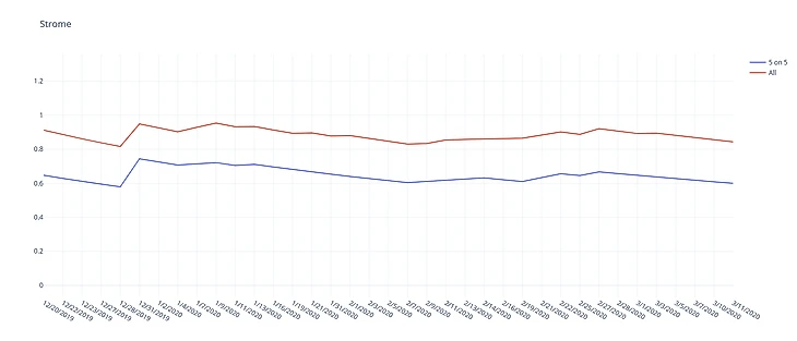Но с Панариным он действительно производил, хотя по ходу сезона с затягиванием гаек комманд оппонентов после нового года его производительность немного в конечном игоге упала и под конец сезона составила 0.84 очка за игру и 0.6 5 на 5, и это тот момент который действительно по ходу сезона у Строма заметно сполз. Говоря о ПП, сама реализация, как было показана выше явно поднялась, и Стром в том сезоне являлся интегральной частью этого процесса, подбор, передача на поинт защитнику, на этом поприще он заметно преуспел.