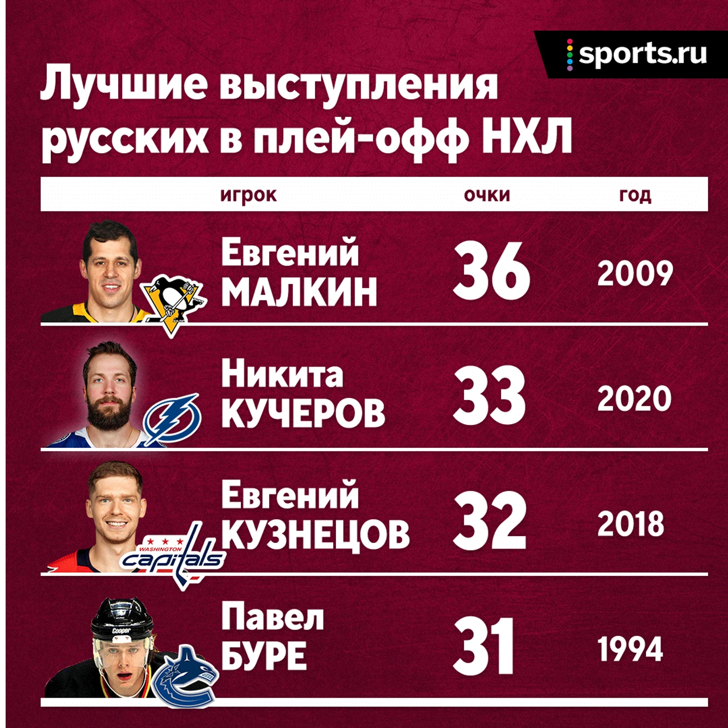 А в списке лучших русских бомбардиров в одном плей-офф Кучеров оторвался от Кузнецова и стал вторым в истории.