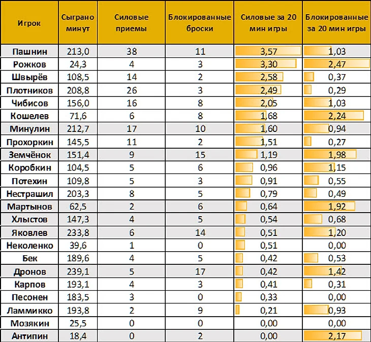 Лидерство Пашнина по силовым приёмам не вызывает вопросов, для этого Михаила и приглашали. А вот нахождение Песонена и Ламмикко в подвале этого рейтинга - повод для обсуждений. Финны не показывают бомбардирских качеств, не видно их и в силовой игре. Харри при этом за 183 минуты не заблокировал ни одного броска соперника. Спрашивается, зачем нужны такие легионеры, которые ничего не показывают ни в атаке, ни в обороне?