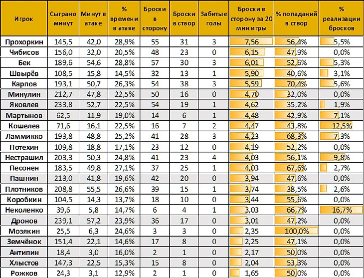 Отдельно стоит остановиться на самом дорогом хоккеисте клуба Плотникове. Сергей носит нашивку капитана, пользуется безграничным доверием тренера, забил только один гол и имеет худший процент попаданий в створ среди нападающих - 61,5% бросков либо летят мимо, либо блокируются соперниками.