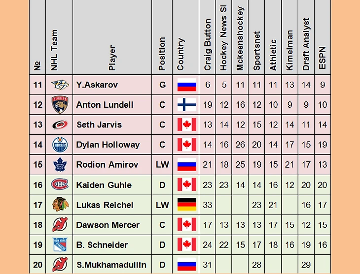 Одиннадцатым ожидаемо выбрали Аскарова, двенадцатым Anton Lundell. Именно эти двенадцать лучших прогнозировалось подавляющим большинством экспертов. Что видно по таблице. Произошли только изменения мест внутри этой группы игроков.