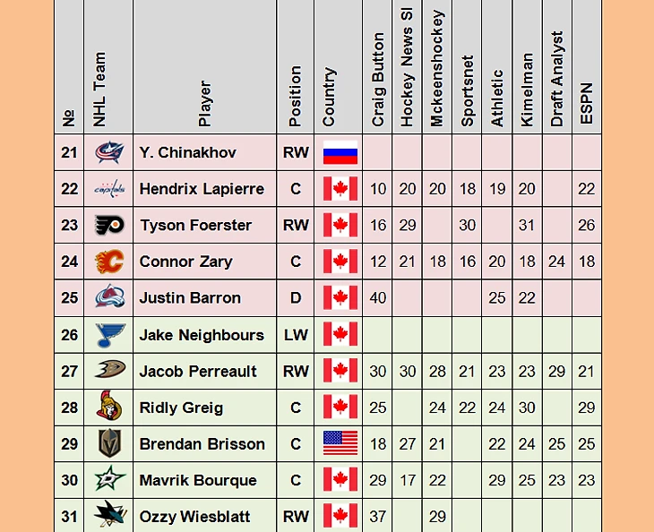 Привожу ниже три таблицы с итогами выбора на драфте и прогнозах экспертов. Рейтинги с прогнозами выходили в разное время, возможны некоторые неточности. Поскольку статья выходит в день выбора драфта, то и время на проверку ограниченно. Задача таблиц показать итоги драфта и разницу в прогнозах экспертов.
