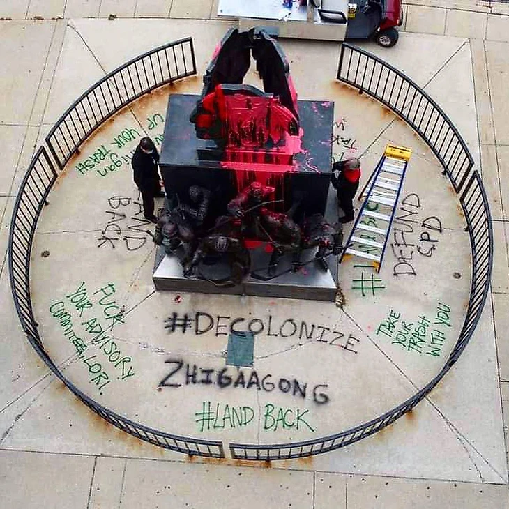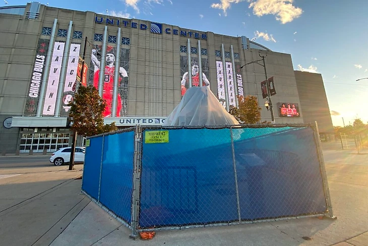 Вчера ночью возле домашней арены «ястребов» вандалы испортили статую, которая была открыта 20 лет назад в честь 75-летия «Блэкхоукс». Памятник облили краской, а вокруг всё усыпали надписями - «землю обратно». На данный момент статуя накрыта и ограждена забором. На днях она отправится на ремонт.