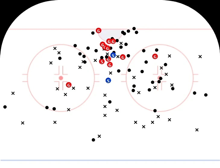 Статистический партнёр InStat позволяет углубиться в дебри продвинутой статистики. Сходу можно проанализировать карту бросков Гранлунда в этом регулярном чемпионате. Напомним, что красные отметки – голы игрока, отметки-«шайбы» – броски в створ, а крестики – заблокированные броски.