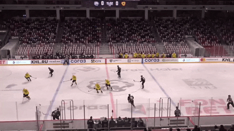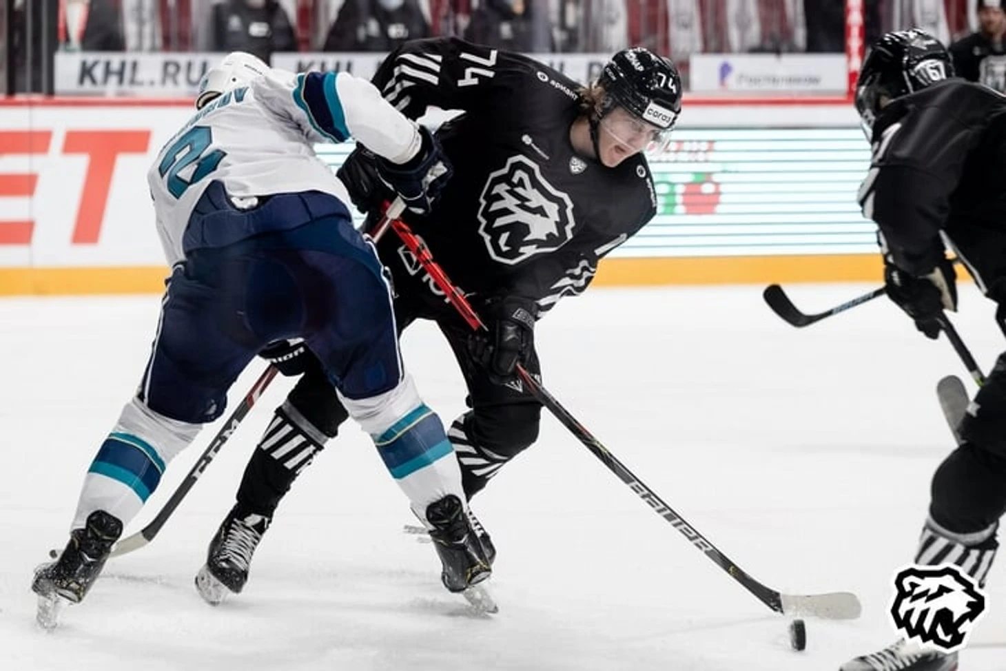 Здесь пытается обыграть защитника, получает тычок и падает на лед, упуская шайбу.
