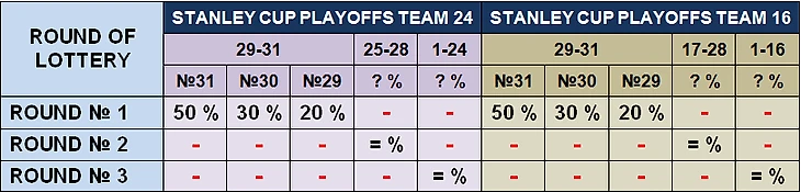 После этого я прочёл статьи об этой встрече, на некоторых зарубежных ресурсах стали появляться предложения о конкретных шагах по реформе лотереи. Повышение процентов выигрыша для худшей команды, ограничение глубины потери места последнего клуба, лимит на максимальное поднятие после выигрыша в лотерею, розыгрыш только двух мест и т.д. Один из этих минимальных вариантов наиболее вероятен к реализации НХЛ. Поскольку после встречи ГМ, как сообщил Фридман “лига запросила конкретные предложения” мне показалось интересным попытаться предложить своё решение вопроса.